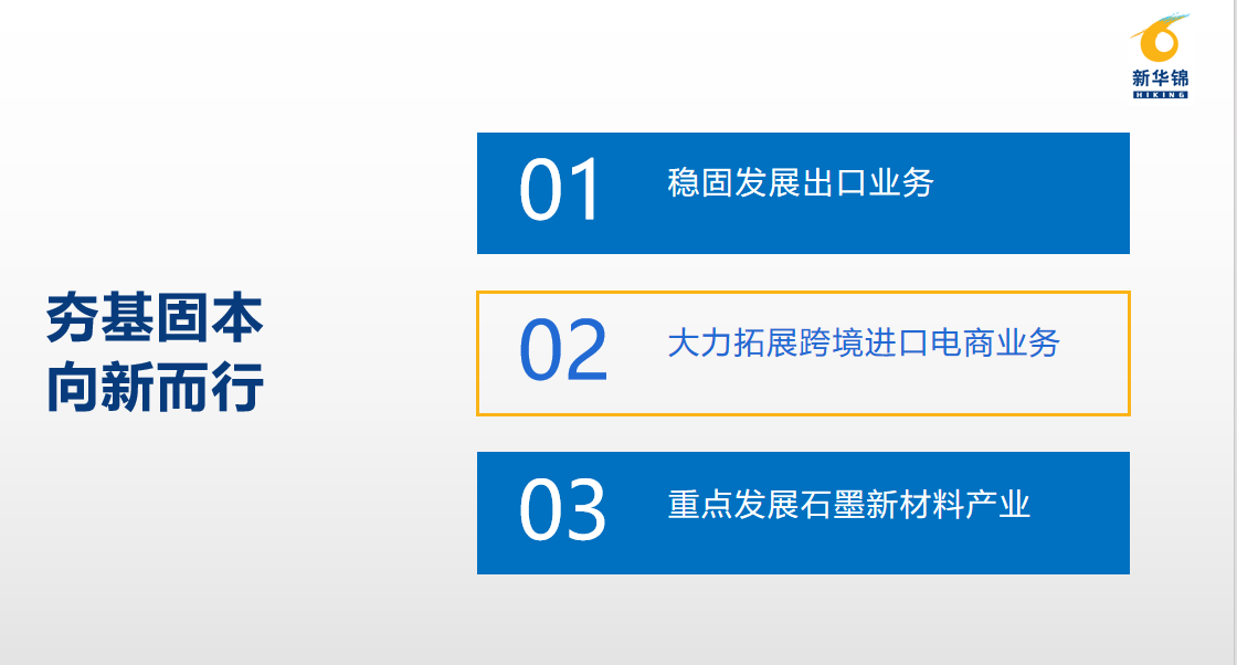 今年会 总部位于山东青岛,是新华锦集团旗下A股上市公司。公司在国际贸易业务领域深耕多年,主营发制品和纺织品服装产品的生产加工及业务出口业务,同时布局了石墨新材料产业和跨境进口电商业务,已逐步形成了“两大核心战略”“四个业务板块”,初步建立了“新贸易、新材料”的产业格局。